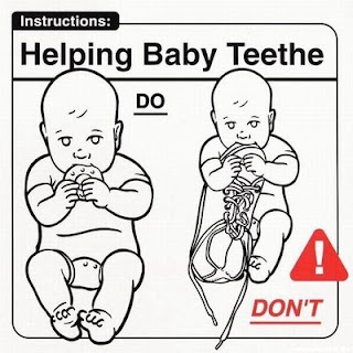 So, my little girl is in the process of cutting her first teeth. Which means there is myriad of symptoms to deal with: low grade fevers, inflamed gums, loose stools (a.k.a. Hershey squirts), irritability and excessive drooling (why is nothing with children easy?). I’ve read that some children go through teething without any apparent problem, at all. But that sounds like a bunch of horse shit to me. I have yet to meet a parent who has had this experience. It sounds like one of those phony stories made up by parents who think that they’ve given birth to the next Einstein. You know the ones that can never shut up about how brilliant there kid is. Meanwhile, the kid is sitting in the corner eating his own snot; or worse yet, someone else’s. But, once again, I digress.So, inevitably your asking: Notelgge, when will my little angel’s first pearly whites start to poke through? Well don’t worry, as usual, Pater’s Potpourri is here with everything you need to know. Most babies get their first tooth at around 6 months, but your child's chompers may appear as early as 3 months or as late as 14, depending on such factors as whether you and your baby’s mom are related (just fucking around with that last part, don’t send me any letters). Typically, babies get their teeth in pairs. First come the middle two on the bottom. A month or so later, the two above those arrive.